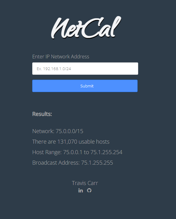 This project calculates the total usable hosts for an IP network, I built this web app with Python using the Flask web framework. This app is hosted on AWS.
