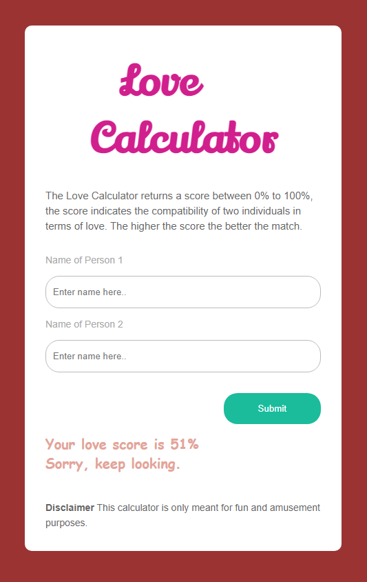 This app was made out of pure fun, it calculates the love score between two individuals. I built this web app with Python using the Flask web framework. This app is hosted on AWS.